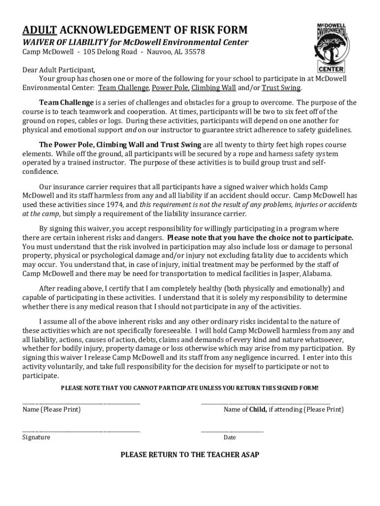 ADULT ACKNOWLEDGEMENT OF RISK FORM WAIVER OF LIABILITY for McDowell Environmental Center Camp McDowell 105 Belong Road Navies, AL 35578Dear Adult Participant, Your group has chosen one or more of