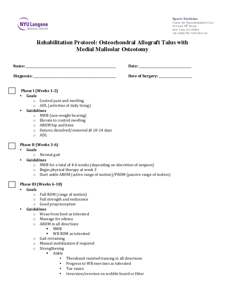 Sports MedicineCenter for Musculoskeletal Care 333 East 38th Street New York, NY 10016 Tel: (646) 5017223 (RACE)501Rehabilitation Protocol: Osteochondral Allograft Talus with Medial Alveolar OsteotomyName: