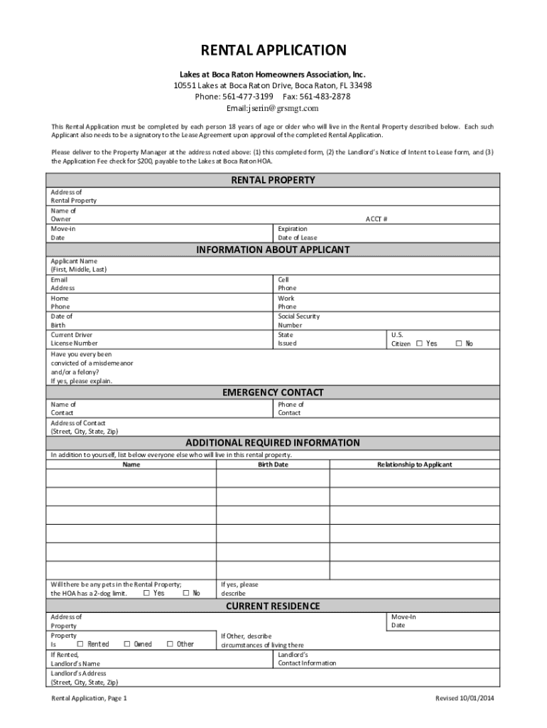 RENTAL APPLICATION Lakes at Boca Raton Homeowners Association, Inc. 10551 Lakes at Boca Raton Drive, Boca Raton, FL 33498 Phone: 5614773199 Fax: 5614832878 Email:jserin@grsmgt.com This Rental Application