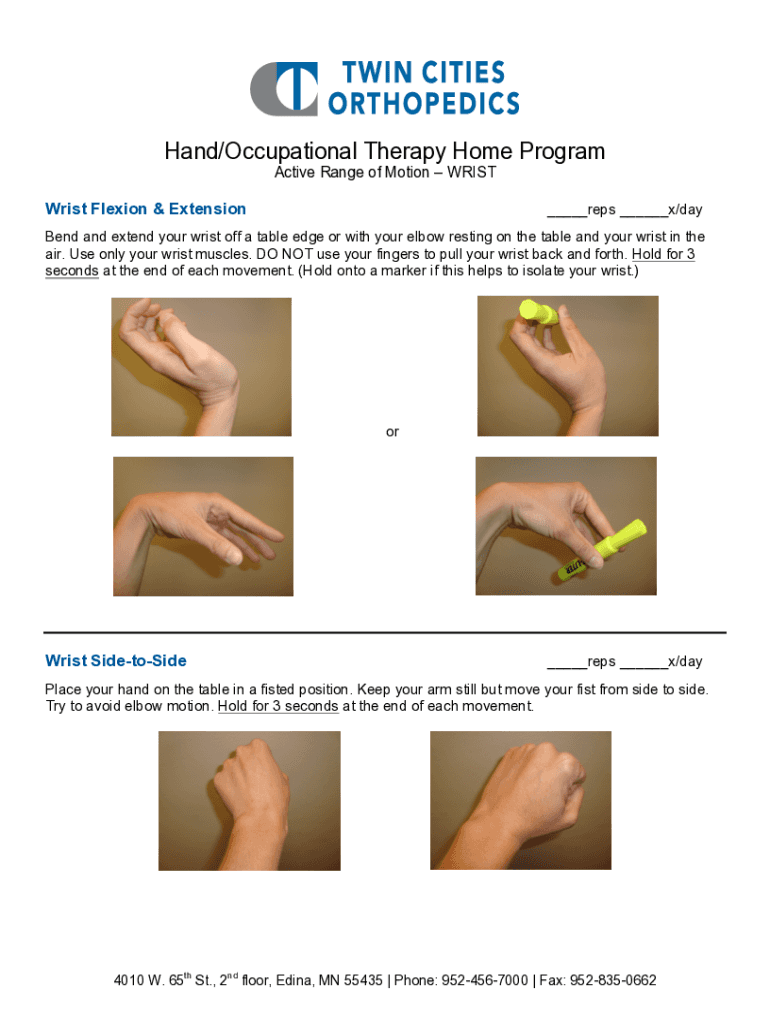 Hand/Occupational Therapy Home Program Active Range of Motion WRISTWrist Flexion & Extension___reps ___x/daybed and extend your wrist off a table edge or with your elbow resting on the table and your