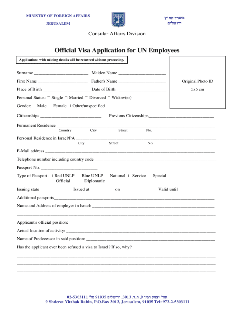 MINISTRY OF FOREIGN AFFAIRS JERUSALEMConsular Affairs DivisionOfficial Visa Application for UN Employees Applications with missing details will be returned without processing. Surname ___ Maiden Name