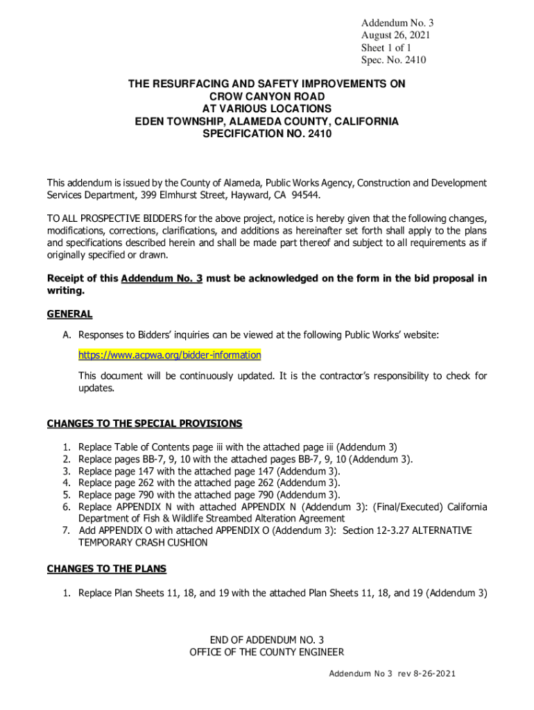 Addendum No. 3 August 26, 2021, Sheet 1 of 1 Spec. No. 2410 THE RESURFACING AND SAFETY IMPROVEMENTS ON CROW CANYON ROAD AT VARIOUS LOCATIONS EDEN TOWNSHIP, ALAMEDA COUNTY, CALIFORNIA SPECIFICATION