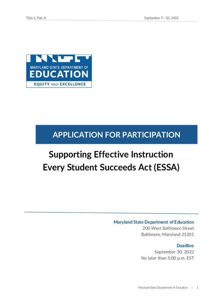 Title II, Part September 9 30, 2022APPLICATION FOR PARTICIPATIONTitle II, Part Supporting Effective Instruction Every Student Succeeds Act (ESSAY)Maryland State Department of Education 200 West Baltimore