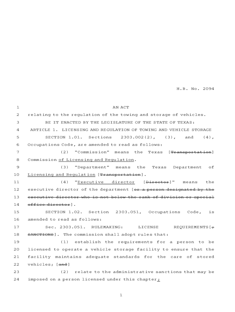 H.B.ANO. A2094AN ACT1 2 3 4 5 6relating to the regulation of the towing and storage of vehicles. BE IT ENACTED BY THE LEGISLATURE OF THE STATE OF TEXAS: ARTICLE 1.SECTIONA1.01. Sections(2)AA\” Commission\”(3),