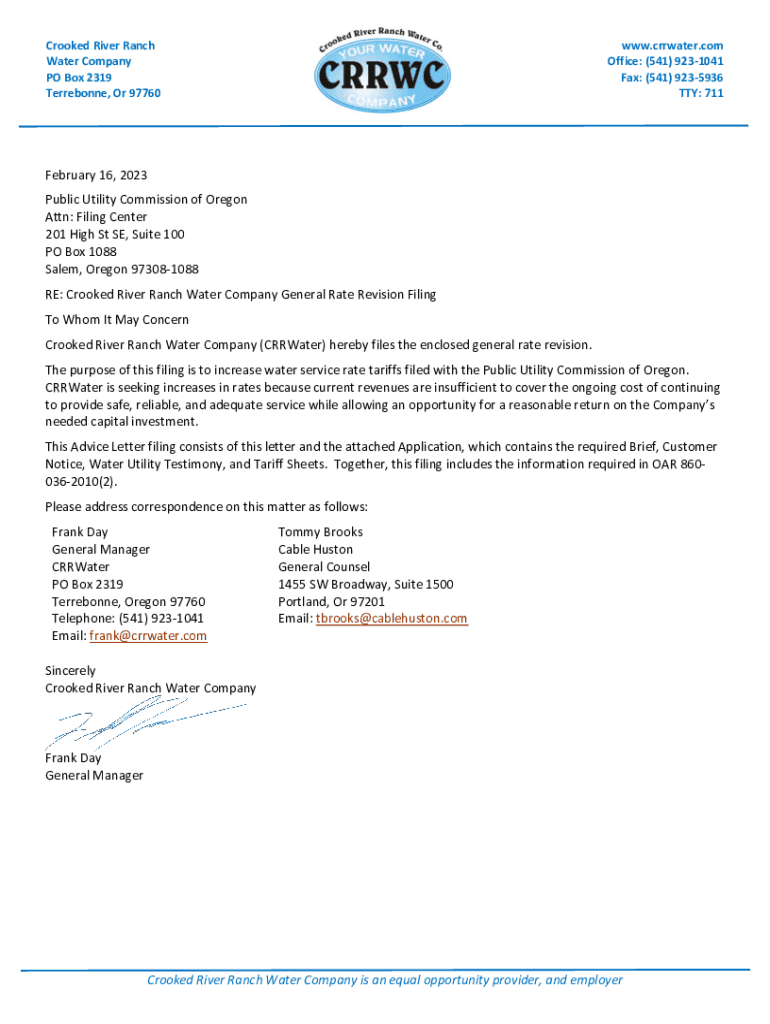 Crooked River Ranch Water Company PO Box 2319 Terrebonne, Or 97760www.crrwater.com Office: (541) 9231041 Fax: (541) 9235936 TTY: 711February 16, 2023 Public Utility Commission of Oregon Attn: Filing