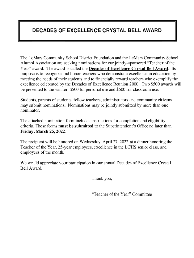 DECADES OF EXCELLENCE CRYSTAL BELL Awardee Lemurs Community School District Foundation and the Lemurs Community School Alumni Association are seeking nominations for our jointly sponsored Teacher