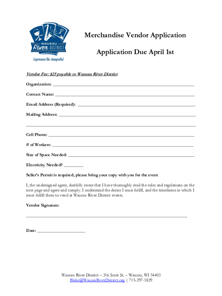 Merchandise Vendor Application Due April 1st Vendor Fee: $25 payable to Wausau River District Organization: ___ Contact Name: ___ Email Address (Required): ___ Mailing Address: ___ ___ Cell Phone:
