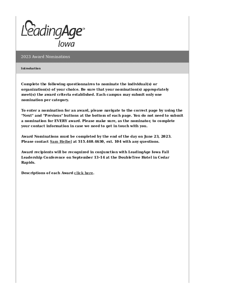 2023 Award Nominations IntroductionComplete the following questionnaires to nominate the individual(s) or organization(s) of your choice. Be sure that your nomination(s) appropriately meet(s) the