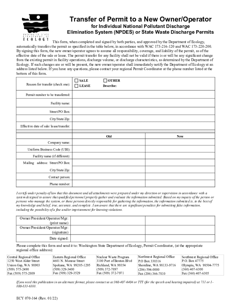 Transfer of Permit to a New Owner/Operator for Individual National Pollutant Discharge Elimination System (NODES) or State Waste Discharge Permits This form, when completed and signed by both parties,