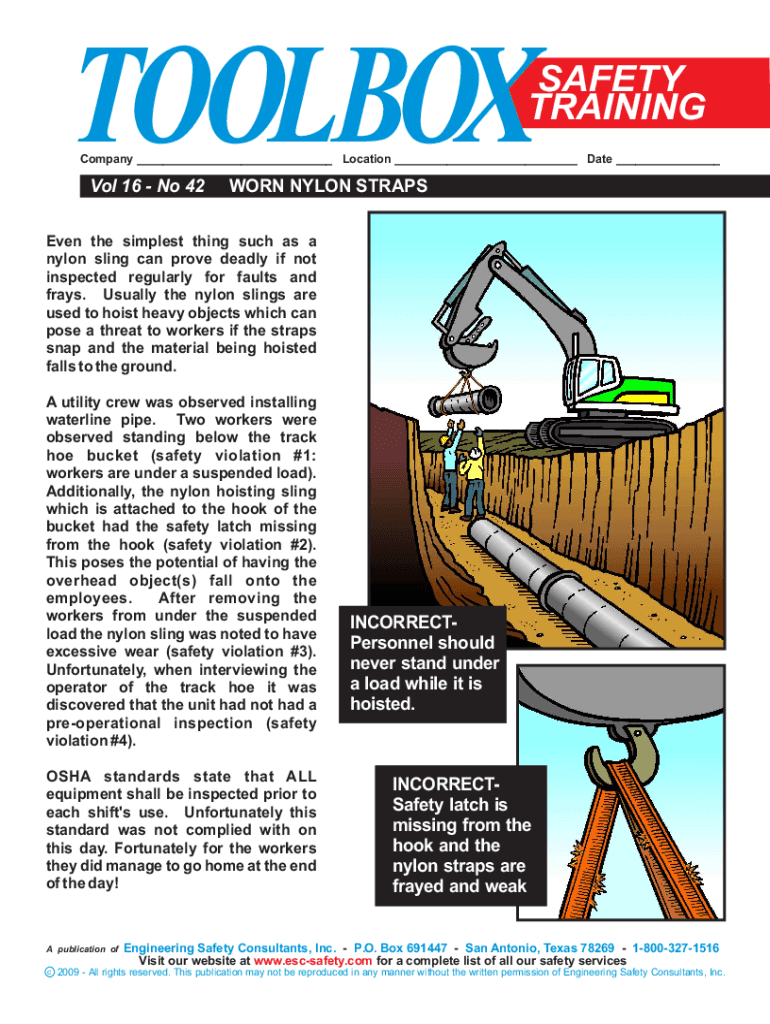 SAFETY TRAINING Company ___ Location ___ Date ___Vol 16 No 42WORN NYLON STRAPSEven the simplest thing such as a nylon sling can prove deadly if not inspected regularly for faults and frays. Usually