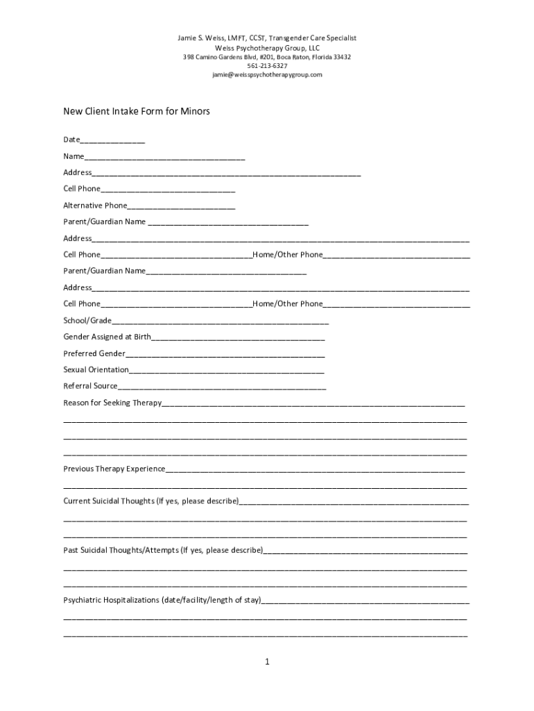 Get the free New Client Intake Form for Minors Weiss Psychotherapy Group Revised April 2016.docx
