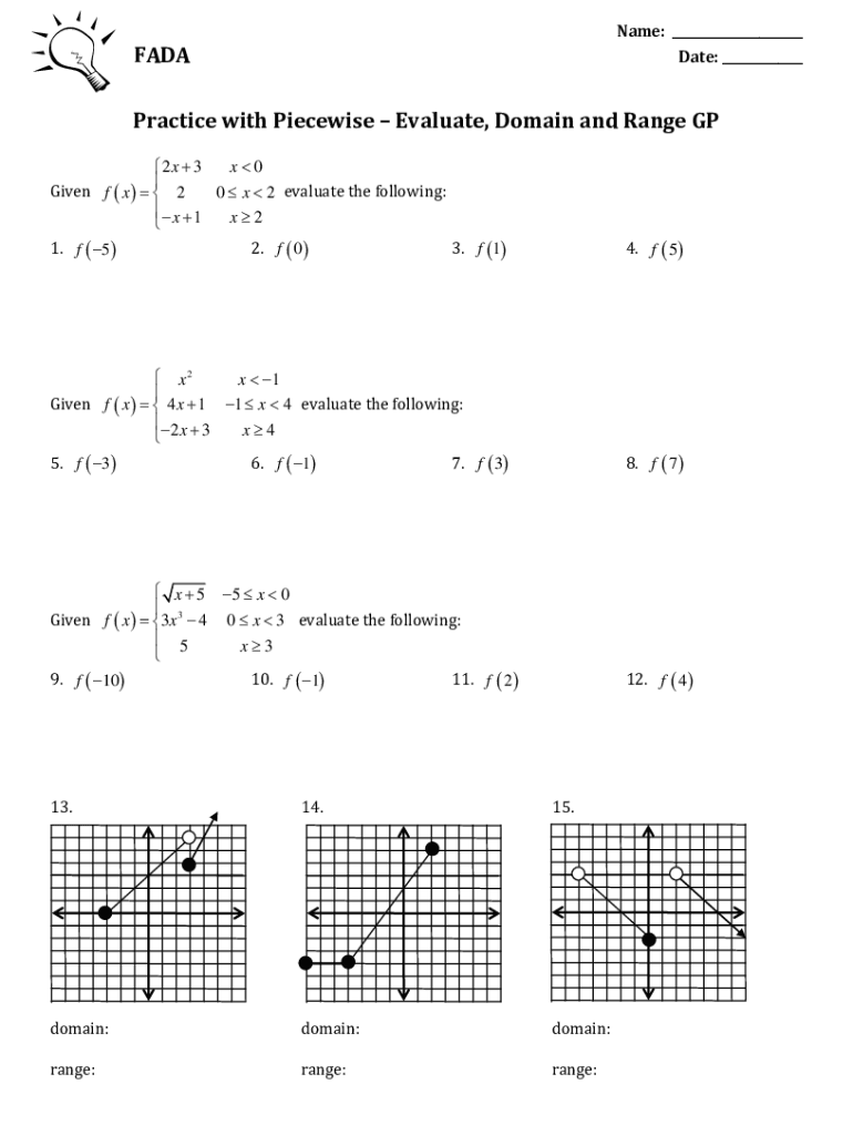 Name: ___ Date: ___Malpractice with Piece wise Evaluate, Domain and Range GP x0 2 × 3 Given f × 2 0 × 2 evaluate the following: x 1 x2 1. F 52. F 0 4. F 5 3. F 1 x2 x 1 Given f × 4 × 1 1 × 4