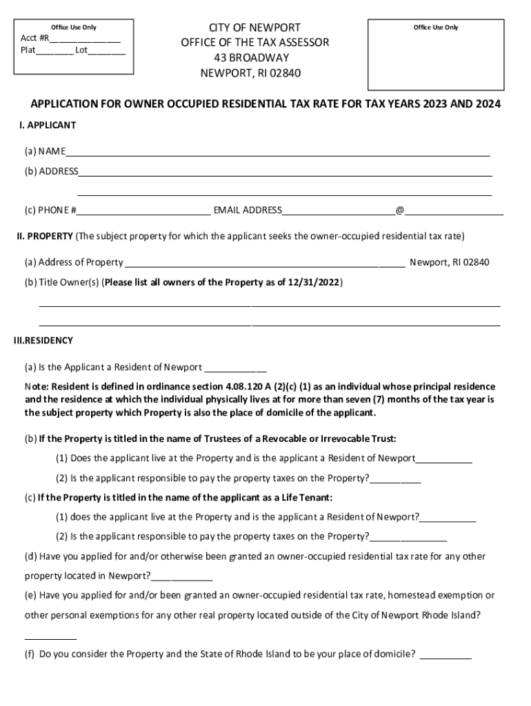 Office Use OnlyAcct #R___ Plat___ Lot___CITY OF NEWPORT OFFICE OF THE TAX ASSESSOR 43 BROADWAY NEWPORT, RI 02840Office Use OnlyAPPLICATION FOR OWNER OCCUPIED RESIDENTIAL TAX RATE FOR TAX YEARS 2023