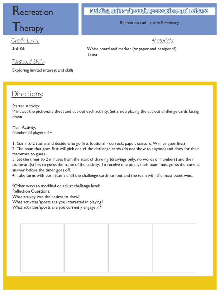5HFUHDWLRQ 7KHUDSRecreation and Leisure PictionaryGrade Level: 3rd8thMaterials: White board and marker (or paper and pen/pencil) TimerTargeted Skills: Exploring limited interest and skillsDirections: