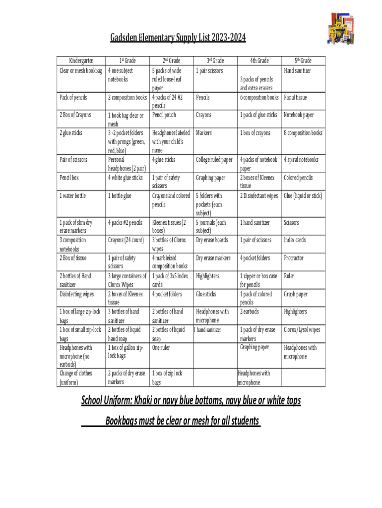 Gadsden Elementary Supply List 20232024 Kindergarten Clear or mesh bookbag1st Grade 4 one subject notebooksPack of pencils2 composition books2 Box of CrayonsPencil box1 book bag clear or mesh 3 2
