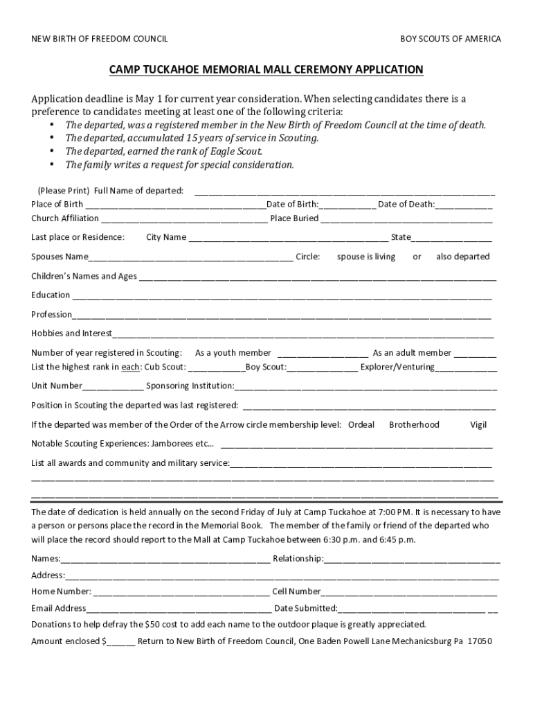 NEW BIRTH OF FREEDOM COUNCILOR SCOUTS OF AMERICANA TUCKAHOE MEMORIAL MALL CEREMONY APPLICATIONApplication deadline is May 1 for current year consideration. When selecting candidates there is preference