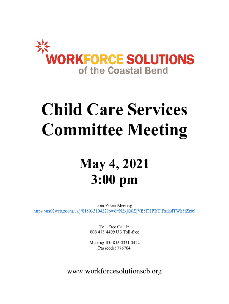 Child Care Services Committee Meeting May 4, 2021 3:00 pm Join Zoom Meeting https://us02web.zoom.us/j/81503310422?pwdN2xjQ0ZjVE5iT1FRUlFzdndTWk5rZz09 Toll-free Call In 888 475 4499 US Toll free Meeting