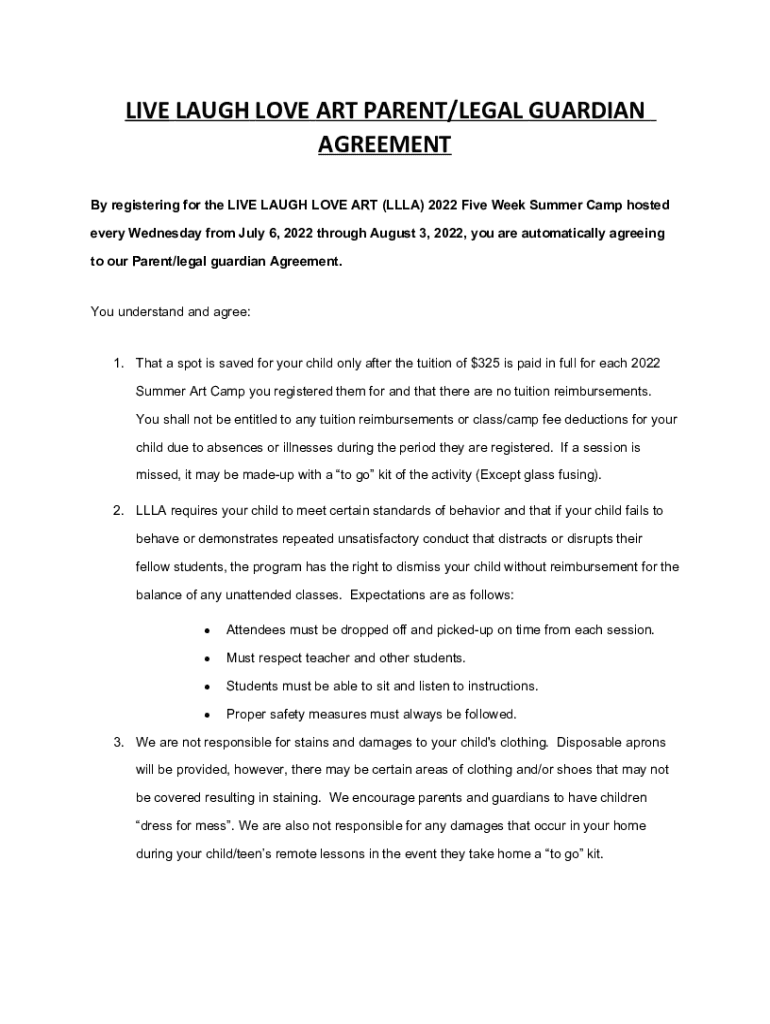 LIVE LAUGH LOVE ART PARENT/LEGAL GUARDIAN AGREEMENT By registering for the LIVE LAUGH LOVE ART (ELLA) 2022 Five Week Summer Camp hosted every Wednesday from July 6, 2022, through August 3, 2022, you