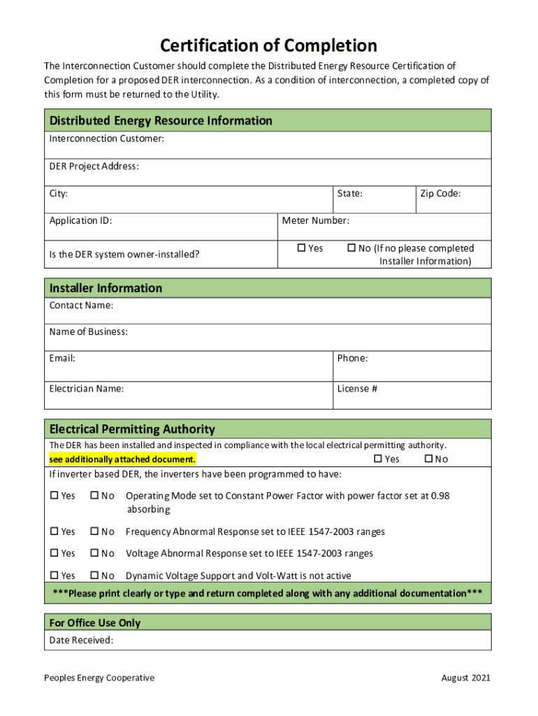 Certification of Completion The Interconnection Customer should complete the Distributed Energy Resource Certification of Completion for a proposed HER interconnection. As a condition of interconnection,