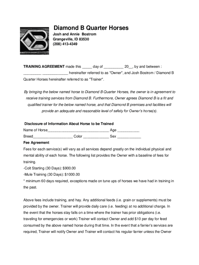 Diamond B Quarter Horses Josh and Annie Bottom Franceville, ID 83530 (208) 4134349TRAINING AGREEMENT made this ___ day of ___ 20__, by and between : ___ ___ hereinafter referred to as \” Owner\”,