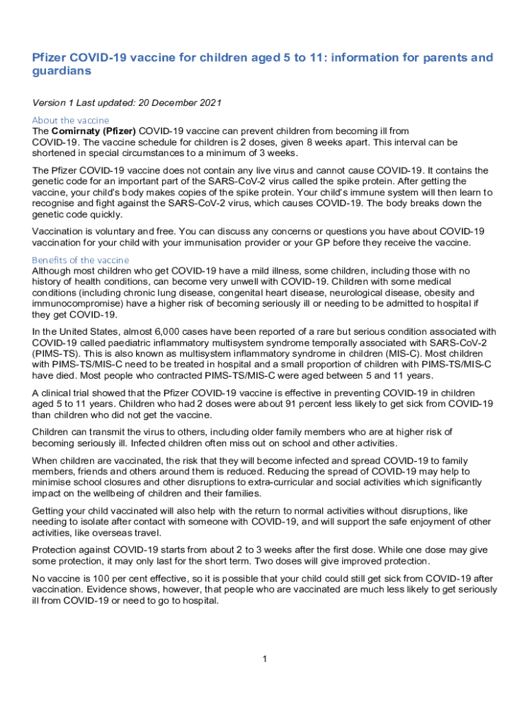 Pfizer COVID-19 vaccine for children aged 5 to 11: information for parents and guardians Version 1 Last updated: 20 December 2021About to vaccinate Community (Pfizer) COVID-19 vaccine can prevent