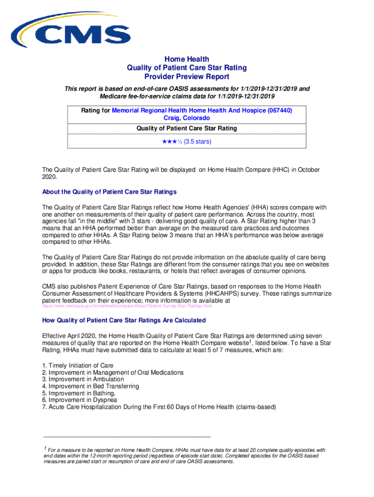 Home Health Quality of Patient Care Star Rating Provider Preview Report This report is based on enforcer OASIS assessments for 1/1/201912/31/2019 and Medicare feeforservice claims data for 1/1/201912/31/2019