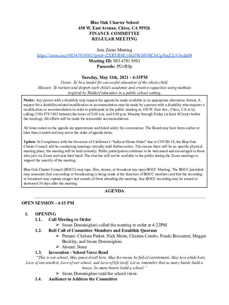 Blue Oak Charter School 450 W. East Avenue, Chico, CA 95926 FINANCE COMMITTEE REGULAR MEETING Join Zoom Meeting https://zoom.us/j/98347919501?pwdZXRYRHUybG5WMVRCbUg5bzZ2cVlwdz09 Meeting ID: 983 4791