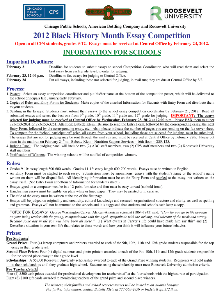 The 2012 Black History Month Essay Competition is an educational form used by Chicago Public Schools (CPS) students to submit essays focused on George Washington Carver.
