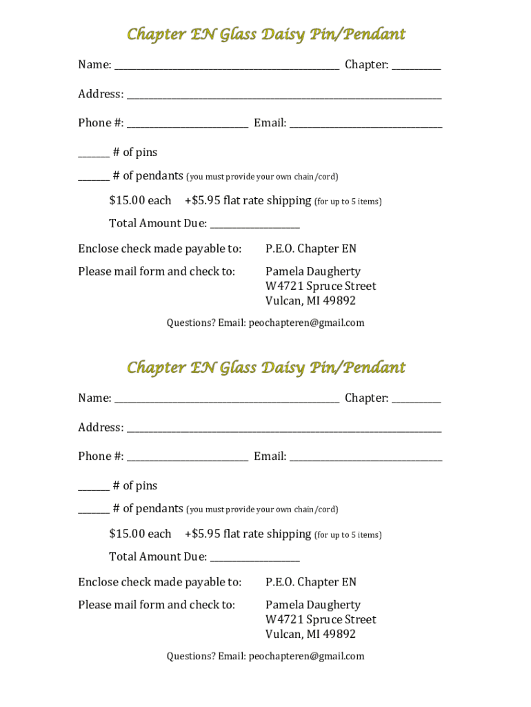 Name: ___Chapter: ___Address: ___Phone #: ___Email: ______ # of pins___ # of pendants (you must provide your own chain/cord)$15.00 each+$5.95 flat rate shipping (for up to 5 items)Total Amount Due: