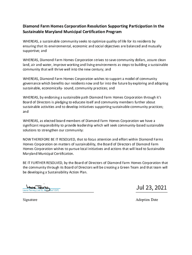 Diamond Farm Homes Corporation Resolution Supporting Participation In the Sustainable Maryland Municipal Certification Program WHEREAS, a sustainable community seeks to optimize quality of life for