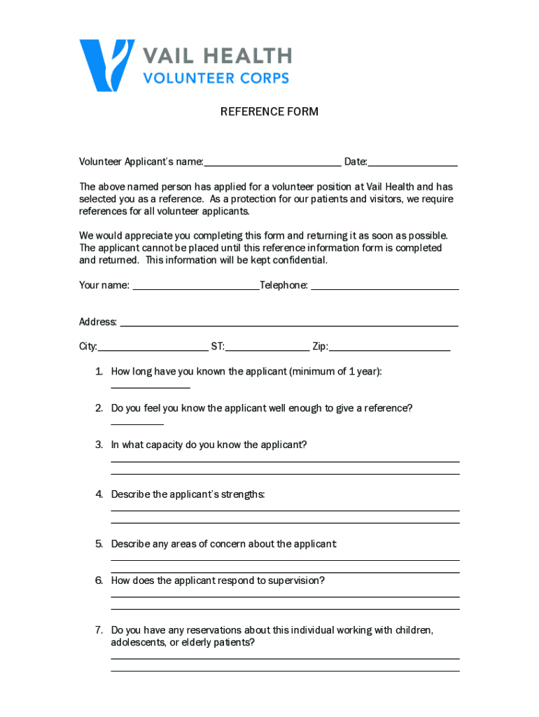 REFERENCE FORMVolunteer Applicants name:___ Date:___ The above named person has applied for a volunteer position at View Health and has selected you as a reference. As a protection for our patients