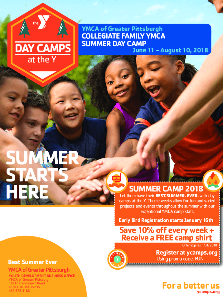YMCA of Greater Pittsburgh CAMPS at the SUMMER STARTS HERECOLLEGIATE FAMILY YMCA SUMMER DAY CAMP June 11 August 10, 2018SUMMER CAMP 2018Let them have their BEST.SUMMER. EVER. With day camps at the