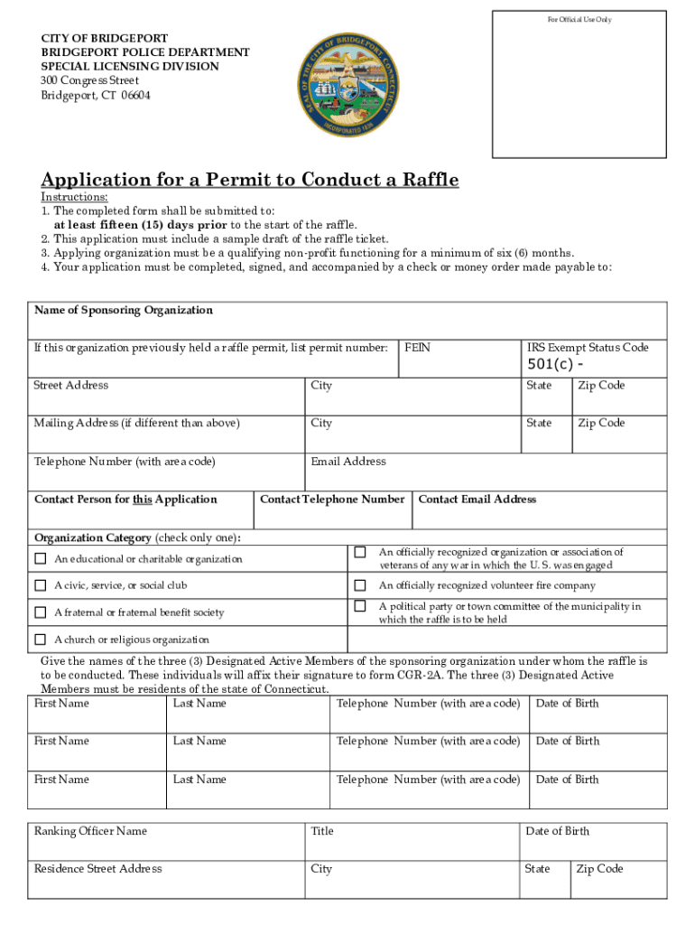For Official Use Velocity OF BRIDGEPORT POLICE DEPARTMENT SPECIAL LICENSING DIVISION 300 Congress Street Bridgeport, CT 06604Application for a Permit to Conduct a Raffle instruction: 1. The completed