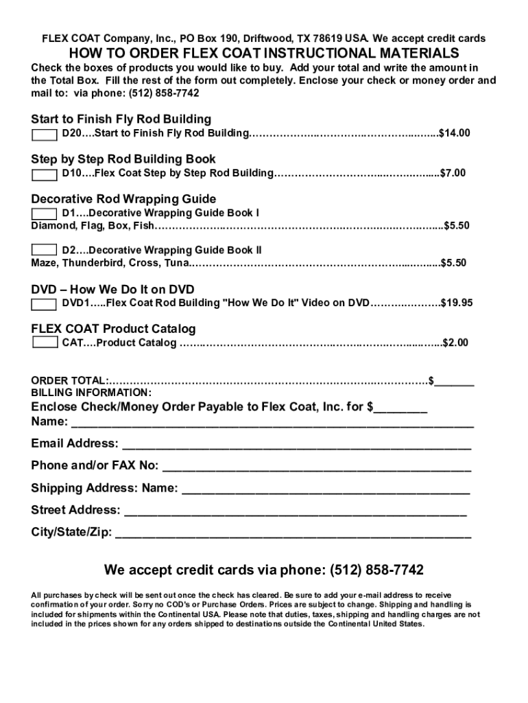 FLEX COAT Company, Inc., PO Box 190, Driftwood, TX 78619 USA. We accept credit cards TO ORDER FLEX COAT INSTRUCTIONAL MATERIALS Check the boxes of products you would like to buy. Add your total and