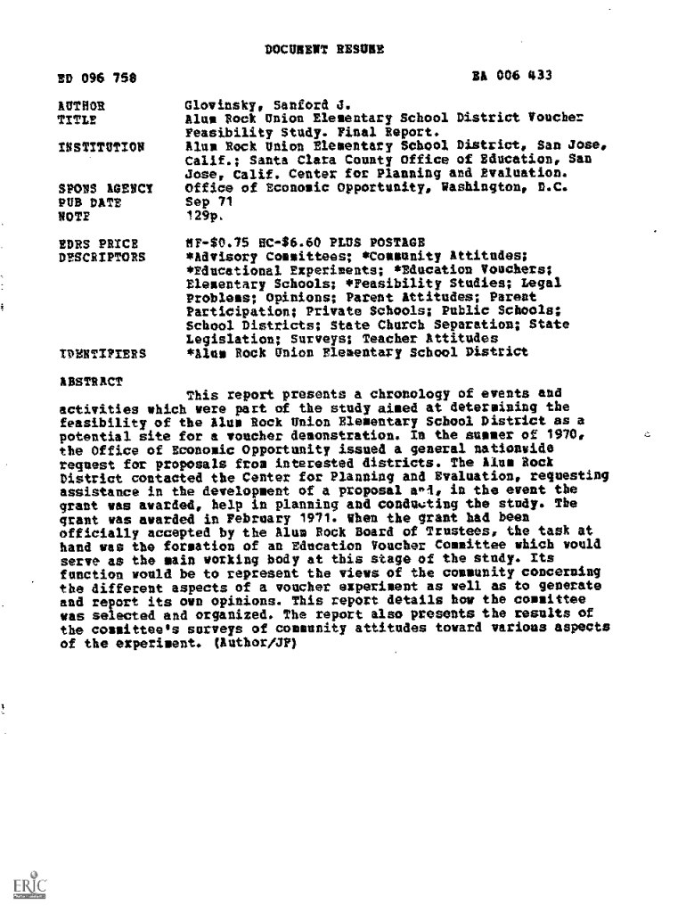 DOCUMENT RESUME BA 006 433ED 096 758 AUTHOR TITLEINSTITUTIONSPONS AGENCY PUB DATE NOTE EARS PRICE DESCRIPTORSIDENTIFIERSGlovinsky, Sanford J. Alum Rock Union Elementary School District Voucher Feasibility