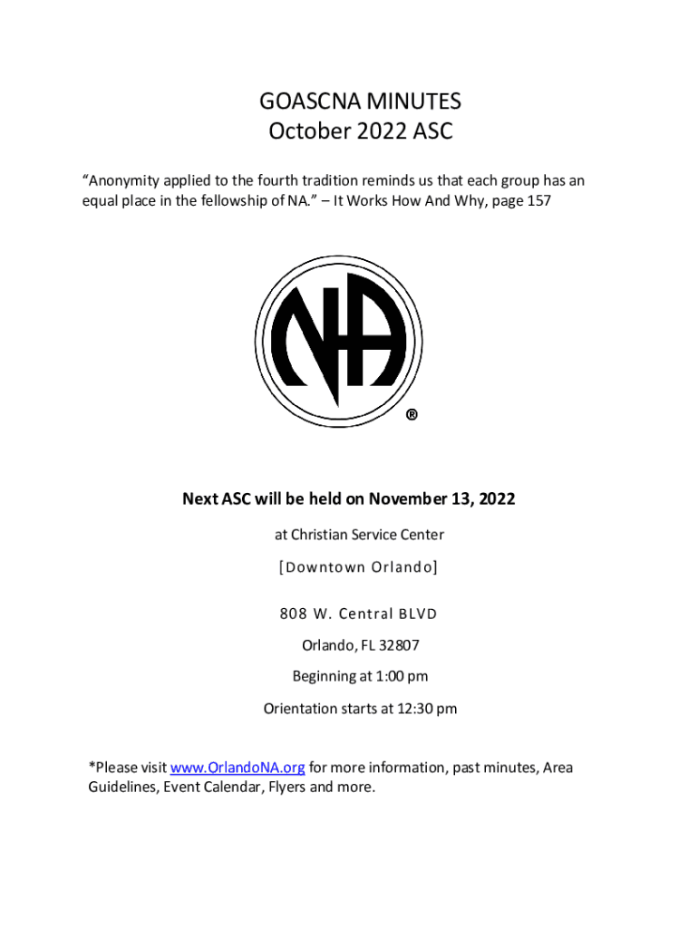 GHANA MINUTES October 2022 ASC Anonymity applied to the fourth tradition reminds us that each group has an equal place in the fellowship of NA. It Works How And Why, page 157Next ASC will be held