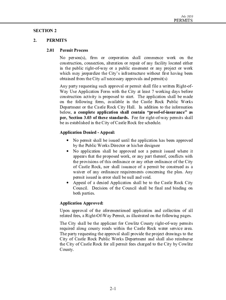 July 2020PERMITS SECTION 2 2.PERMITS 2.01Permit Process No person(s), firm or corporation shall commence work on the construction, connection, alteration or repair of any facility located either in
