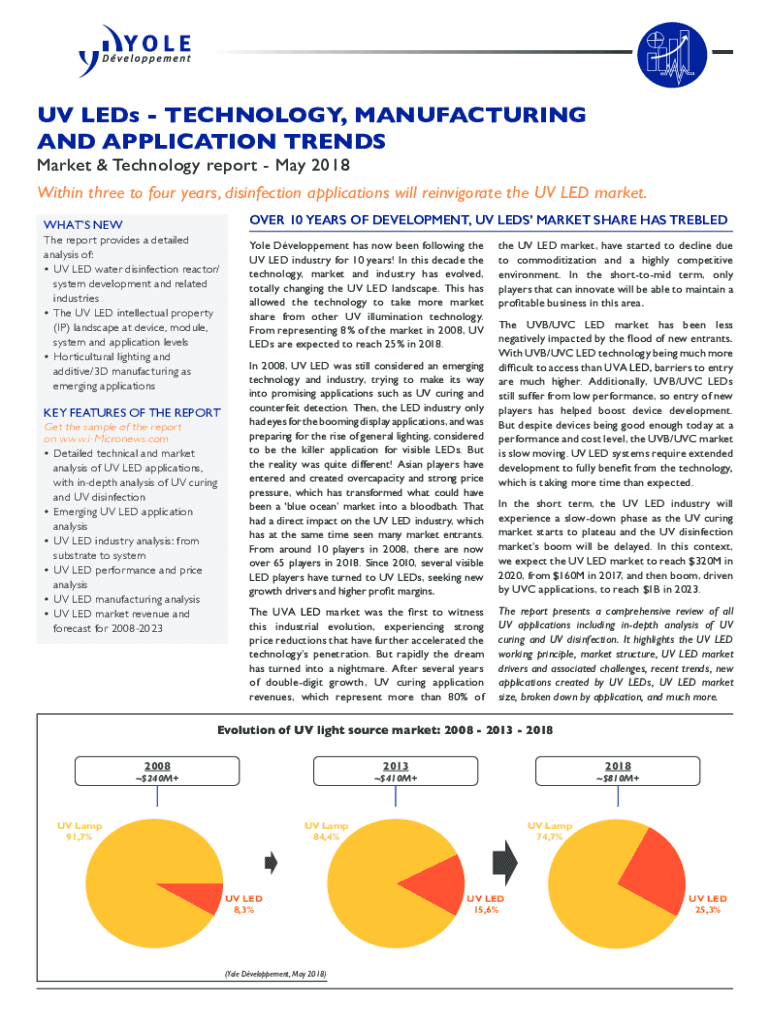 UV LEDs TECHNOLOGY, MANUFACTURING AND APPLICATION TRENDS Market & Technology report May 2018Within three to four years, disinfection applications will reinvigorate the UV LED market. OVER 10 YEARS