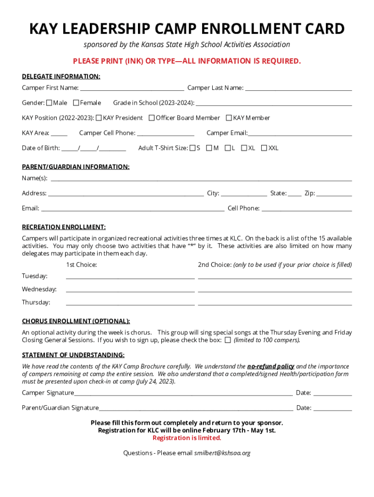 Get the free KAY LEADERSHIP CAMP ENROLLMENT CARD