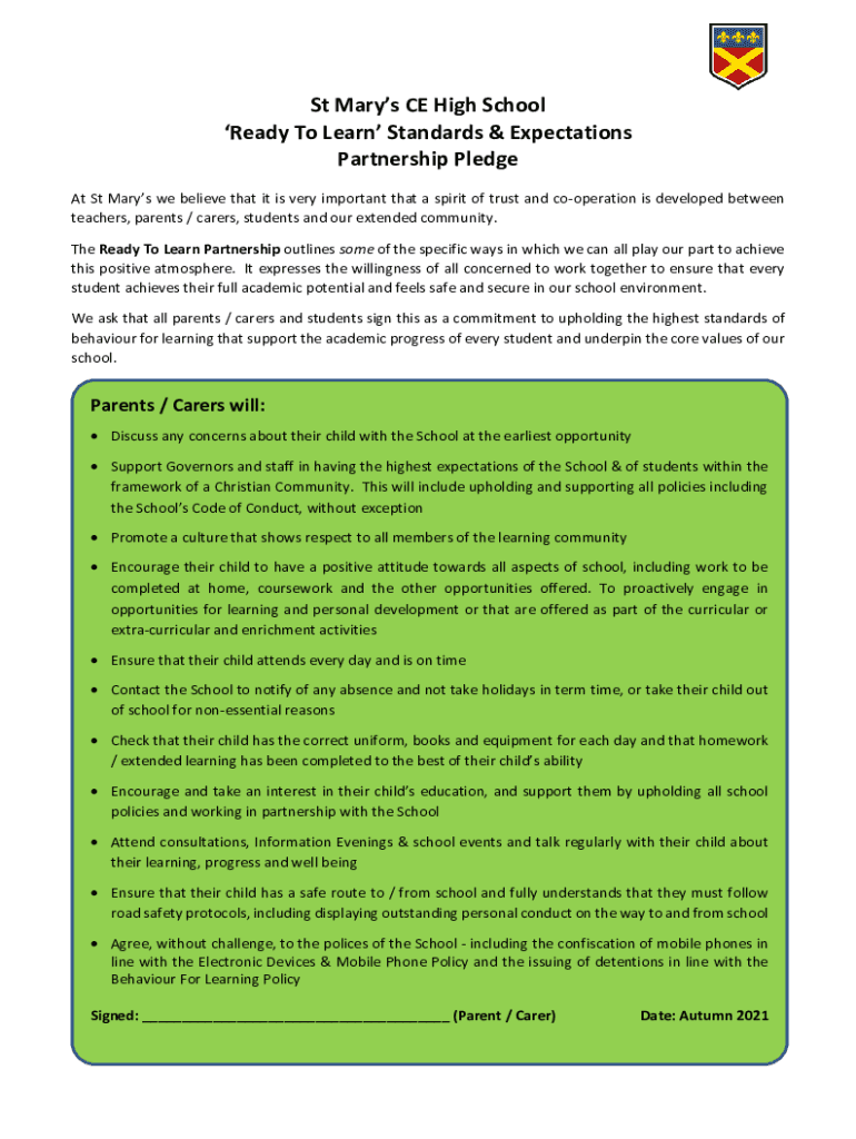 St Mary's CE High School Ready To Learn Standards & Expectations Partnership Pledge At St Mary's we believe that it is very important that a spirit of trust and cooperation is developed between teachers,