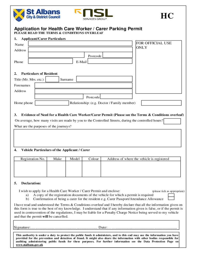 Get the free Health Care Carer Special Permit Application form - stalbans gov