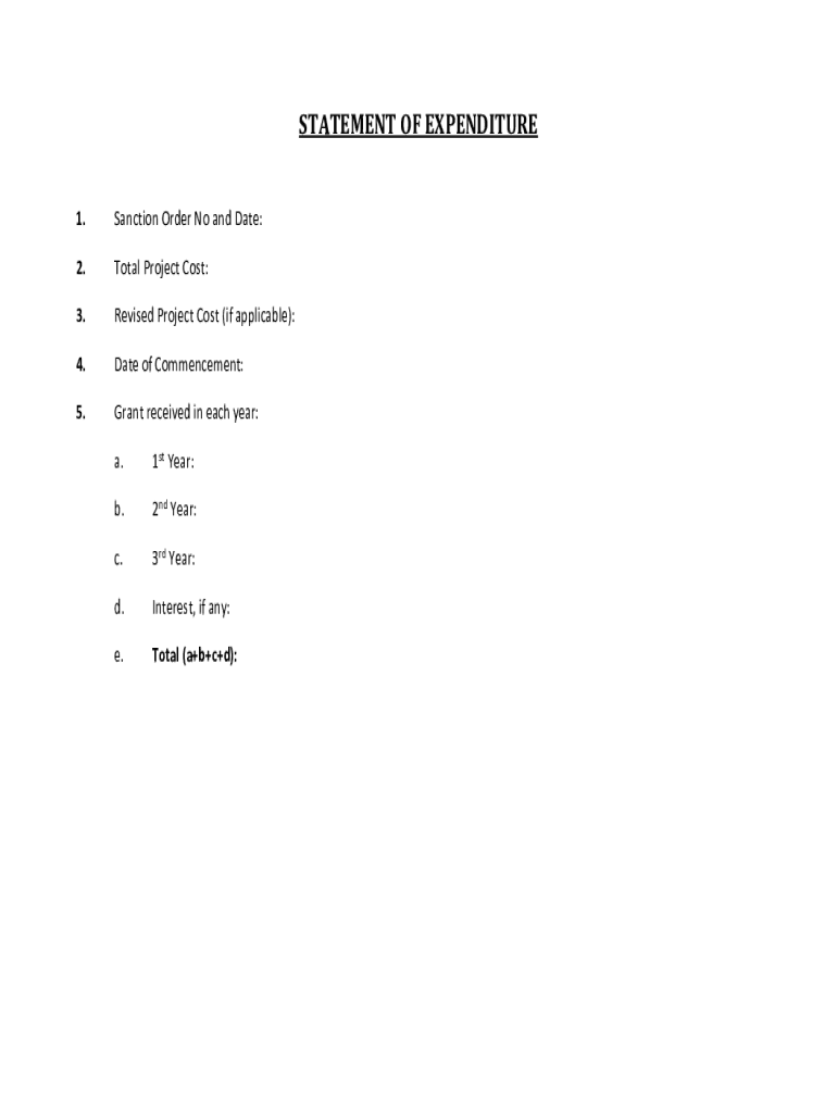 STATEMENT OF EXPENDITURE 1. Sanction Order Now and Date:2. Total Project Cost:3. Revised Project Cost (if applicable):4. Date of Commencement:5. Grant received in each year: a.1st Year:b.2nd Year:c.3rd