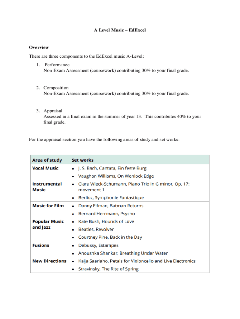 A Level Music EdExcelOverview There are three components to the Excel music Level: 1. Performance None Assessment (coursework) contributing 30% to your final grade.2. Composition None Assessment (coursework)