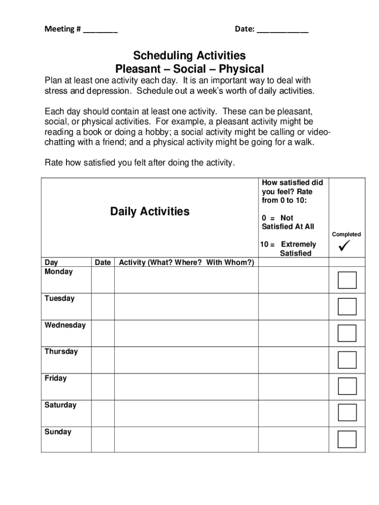 Meeting # ___Date: ___Scheduling Activities Pleasant Social Physical Plan at least one activity each day. It is an important way to deal with stress and depression. Schedule out a weeks worth of daily