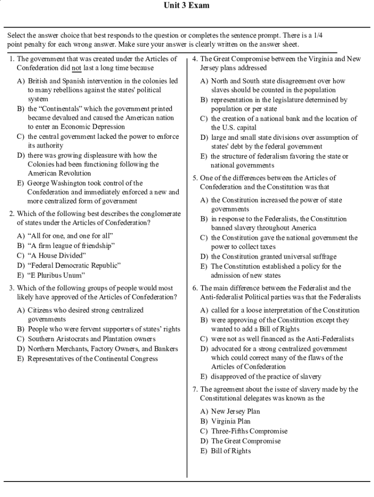 Unit 3 Exam Select the answer choice that best responds to the question or completes the sentence prompt. There is a 1/4 point penalty for each wrong answer. Make sure your answer is clearly written