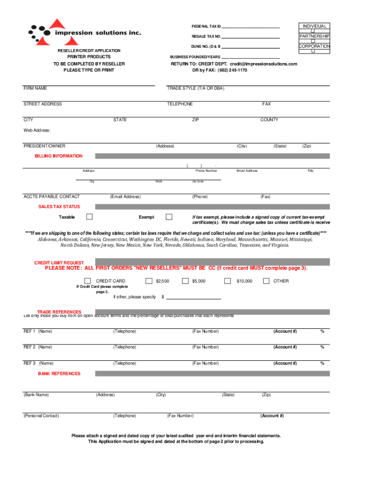 FEDERAL TAX ID ___INDIVIDUALRESALE TAX NO. ___PARTNERSHIPS NO. ’D & B)___CORPORATIONRESELLER/CREDIT APPLICATION BUSINESS FOUNDED/YEARS ___PRINTER PRODUCTS TO BE COMPLETED BY RESELLER PLEASE TYPE