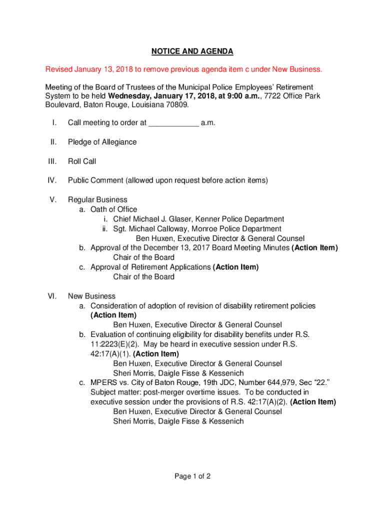 NOTICE AND AGENDA Revised January 13, 2018, to remove previous agenda item c under New Business. Meeting of the Board of Trustees of the Municipal Police Employees Retirement System to be held Wednesday,