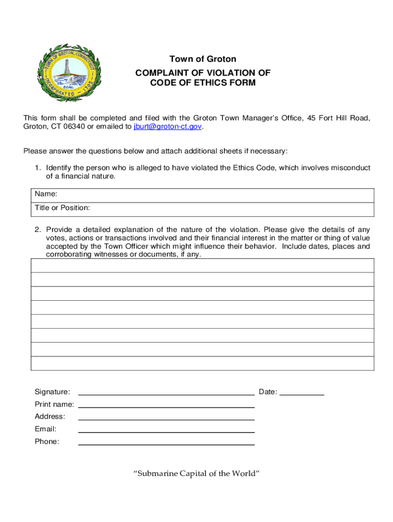 Town of Proton COMPLAINT OF VIOLATION OF CODE OF ETHICS Forms form shall be completed and filed with the Proton Town Managers Office, 45 Fort Hill Road, Proton, CT 06340 or emailed to jburt@grotonct.gov.