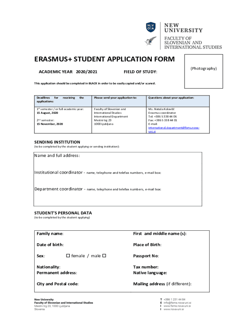 ERASMUS+ STUDENT APPLICATION FORM ACADEMIC YEAR 2020/2021FIELD OF STUDY:(Photography)This application should be completed in BLACK in order to be easily copied and/or scanned. Deadlines for applications:receivingthe1st