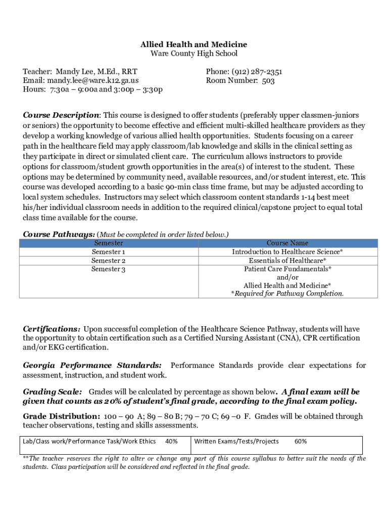 Get the free Allied Health and Medicine Ware County High School ...
